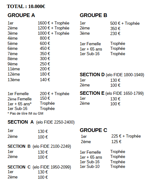 Les prix du classement général, des groupes, des sections, d'âge et de la catégorie féminine ne sont pas cumulatifs. Seul le prix le plus élevé sera attribué.