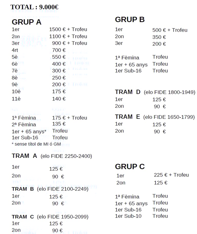 Els premis monetaris iguals o superior a 1000€ es faran efectius mitjançant transferència bancària, mentre que la resta de premis es pagaran en efectiu, i, per poder cobrar-los, serà imprescindible presentar el DNI, NIE o el passaport.